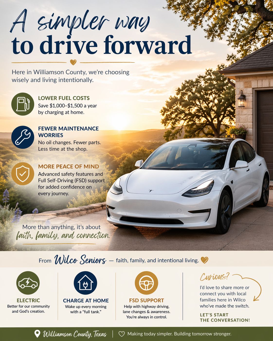 But what we hear most from others isn’t just aoubt money—it’s about peace of mind. One Wilco family shared how much they love knowing their parents are driving a car with Full Self Driving (FSD) capability—helping with things like lane changes, highway driving, and added awareness on the road.